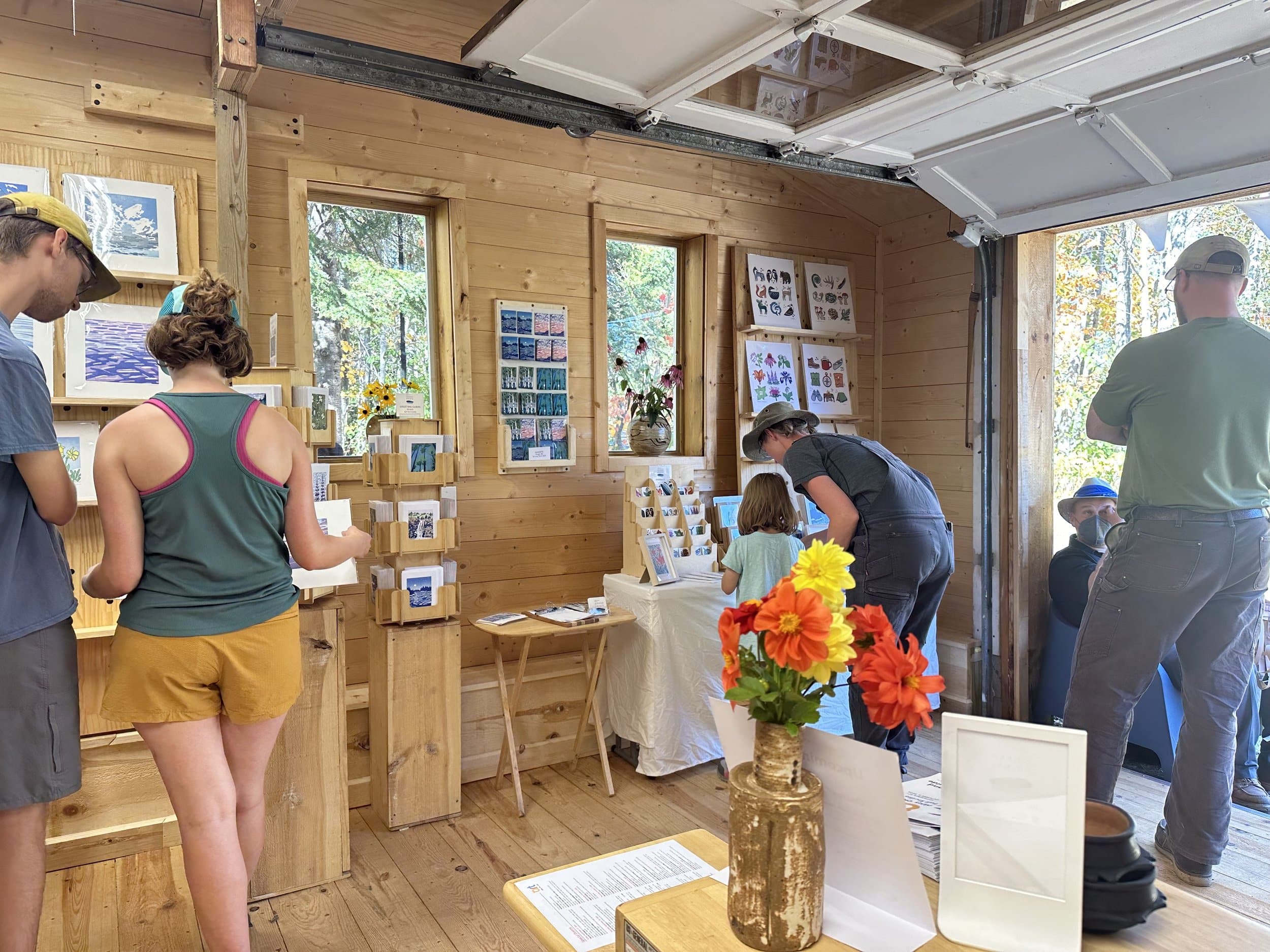 Visitors of all ages browsing Nan Onkka’s printmaking studio.
