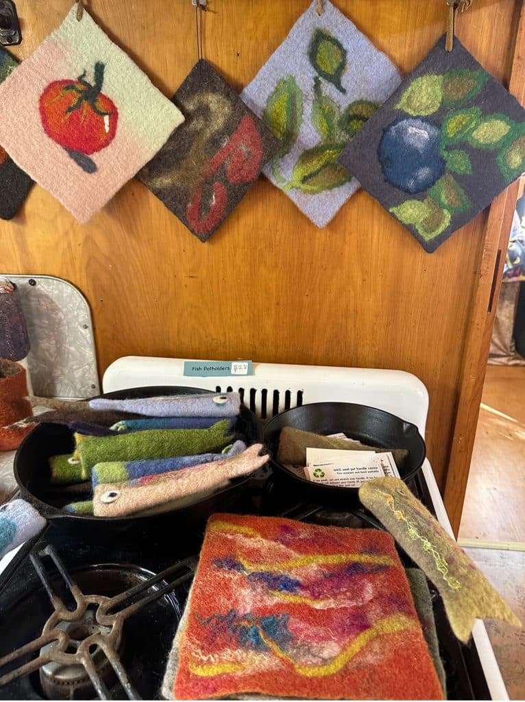 Felted potholders on display inside Elise Kyllo’s Airstream trailer studio.