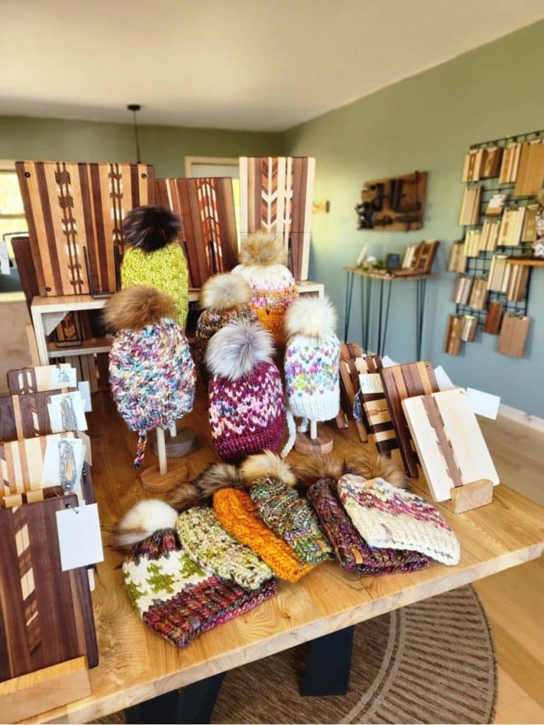 Knitwear by North Road Knits on display alongside cutting boards at The Wilder Woodshop.